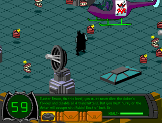 The Joker has hijacked a television broadcast station in Gotham, and has revealed that not only does he plan to broadcast a mind control signal to the inhabitants of Gotham, but has also kidnapped Robin. Batman must find and destroy the Joker’s transmitters while also battling his henchmen and Harley Quinn if he wants to put an end to the villain’s evil scheme and save his comrade, otherwise Joker will make showbiz rough and have Robin on temporary hiatus.