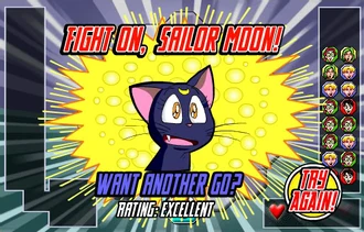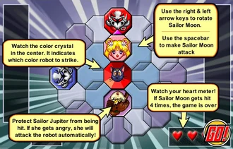 Each robot contains a different color crystal (either red, blue, yellow, or green), and Luna the cat shows the player what color crystal to strike, should multiple robots appear at once. Using the arrow keys to control both Sailor Scouts (Moon on one side, Jupiter on the other), the player then must hit the space bar to revert her classmates back to normal.