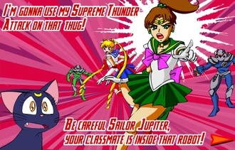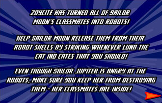 In this game Sailor Moon must help her classmates (who have been turned into robots by Zoycite) get back to normal! In the game the player controls Sailor Moon who must attack her robot classmates to turn them back to normal while trying to avoid getting hit by them herself. If Sailor Moon is hit a total of 4 times, the player loses the game. The player must also prevent Sailor Jupiter from getting hit as she will destroy the robots upon being hit and the player will lose the game.