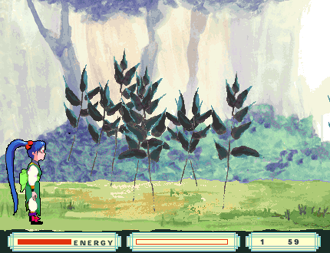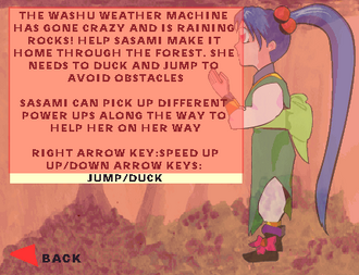 In this game the player takes control of Sasami as she attempts to make it home safely through the forest by avoiding debris from Washu's malfunctioning weather machine. Sasami must also jump over rocks and roll under tree limbs in order to reach her goal safely.