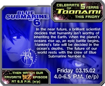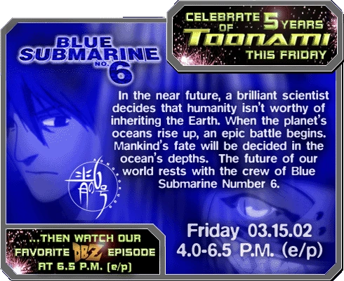 The Toonami 5 Year Anniversary was celebrated on Friday, March 15, 2002, two days before the actual 5 year anniversary (March 17, 2002), with a special airing of Blue Submarine No. 6 from 4:00 PM to 6:30 PM. The celebration then concluded with the Toonami crew's favorite episode of Dragon Ball Z.[1][2]
