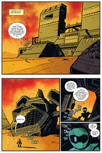 Running out of the settlement, TOM notices a motorcycle and mounts it. The creature, the Trabogog, appears, and chases after TOM. TOM rides towards docking bay 94, and enters through a door, falling a great height, only to catch himself with a grappling hook. Pulling himself to a landing, he notices a larger robot body which he dubs "BIG TOM". Before he can do anything else, cords attach themselves to his body which allows him to control "BIG TOM" to combat the menacing beast. BIG TOM breaks free of the docking bay, and battles the Trabogog. As the battle ensues, the Trabogog destroys the Vindication, much to the horror of TOM. A knife protrudes from BIG TOM's wrist and he stabs the Trabogog in the stomach, before finishing the beast off by decapitating it.